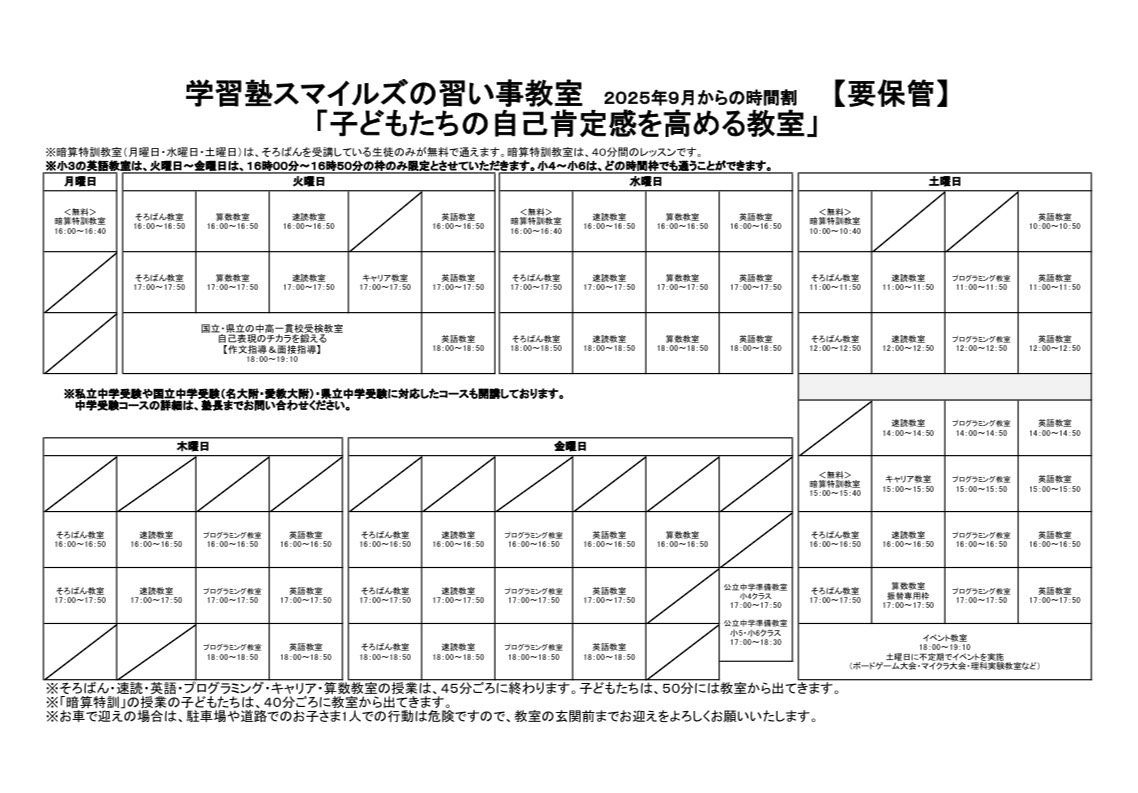 地元の公立中学校に進学予定の小学生向けクラス 週1回 月謝 6,000円(税込み) 【日程】金曜日17:00~18:00 【科目】算数・国語・英語(理社)